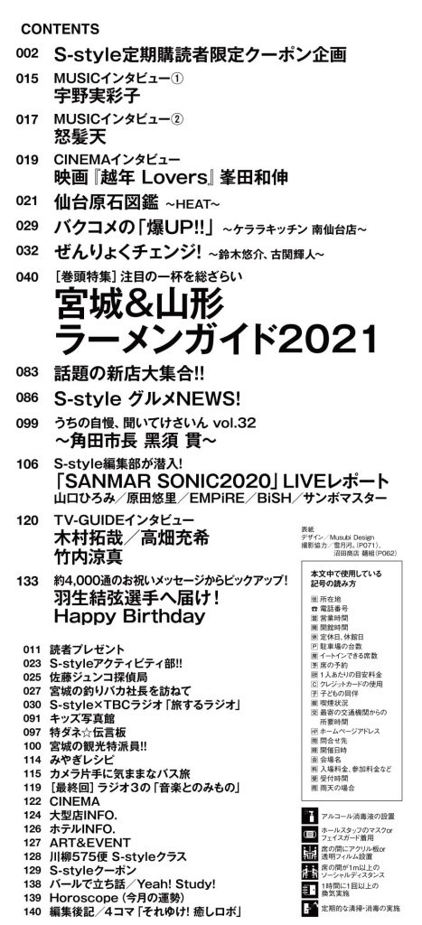 今回は、宮城県内の人気店と『S-style』がコラボレーションし、特別な一杯を期間限定で提供します。さらにラーメンフリークによる座談会や、地元テレビマンが感動したラーメン、2020年にオープンした新店も逃さずお届け。この冬は絶品ラーメンでおいしく温まりましょう!