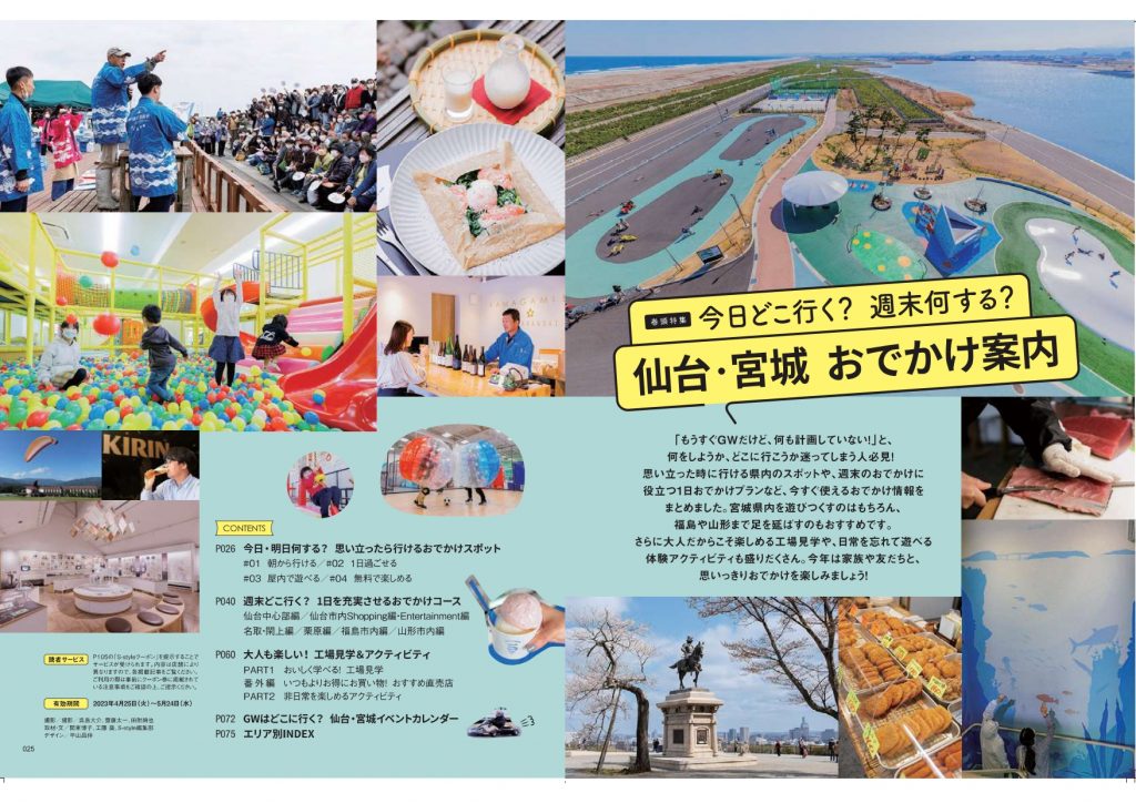 思い立った時に行ける県内のスポットや、週末のドライブに役立つ1日のおでかけプランなど、今すぐ使えるおでかけ情報をまとめました。宮城県内を遊びつくすのはもちろん、福島や山形まで足を延ばすのもおすすめです。
