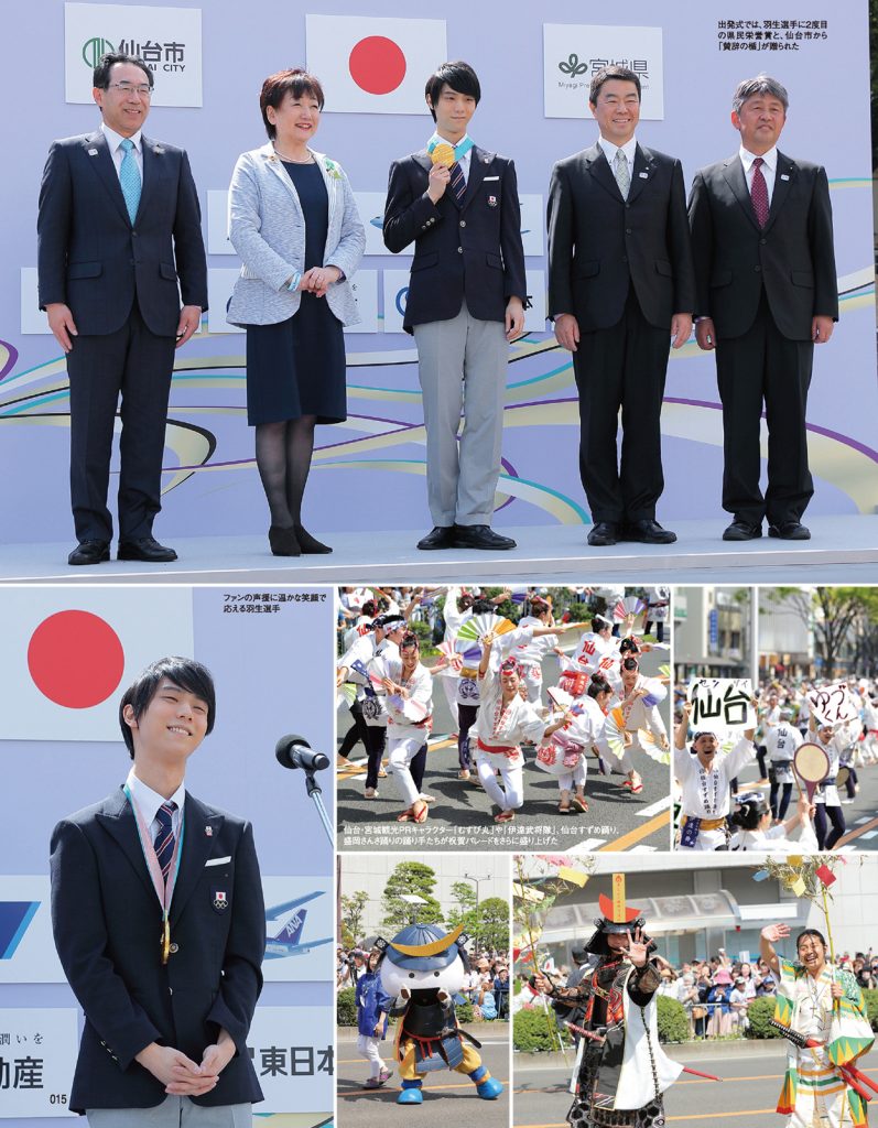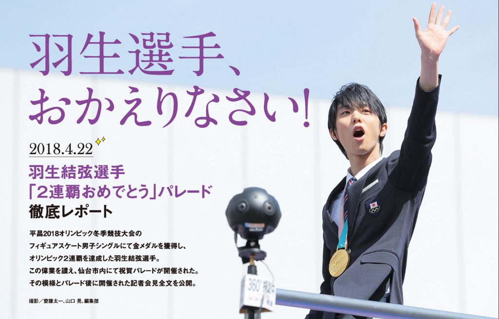 平昌2018オリンピック冬季競技大会のフィギュアスケート男子シングルにて金メダルを獲得し、オリンピック2連覇を達成した羽生結弦選手。この偉業を讃え、仙台市内にて祝賀パレードが開催されました。その模様とパレード後に開催された記者会見全文を8ページに渡って掲載。
