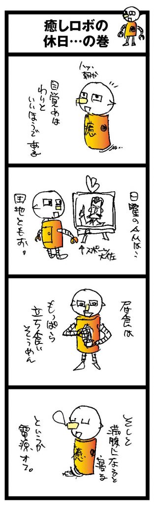 そんなこんなで、あっという間に昼になるわけです。3コマ目は癒しロボの昼食シーン。「もっぱら立ち食いそうめん」とありますが、そばでも、うどんでも、うーめんでも、やきそばでも、もちろんひやむぎでも、よいわけです。このコマで、癒しロボが麺類全般が好物であることをさりげなく明かしています。