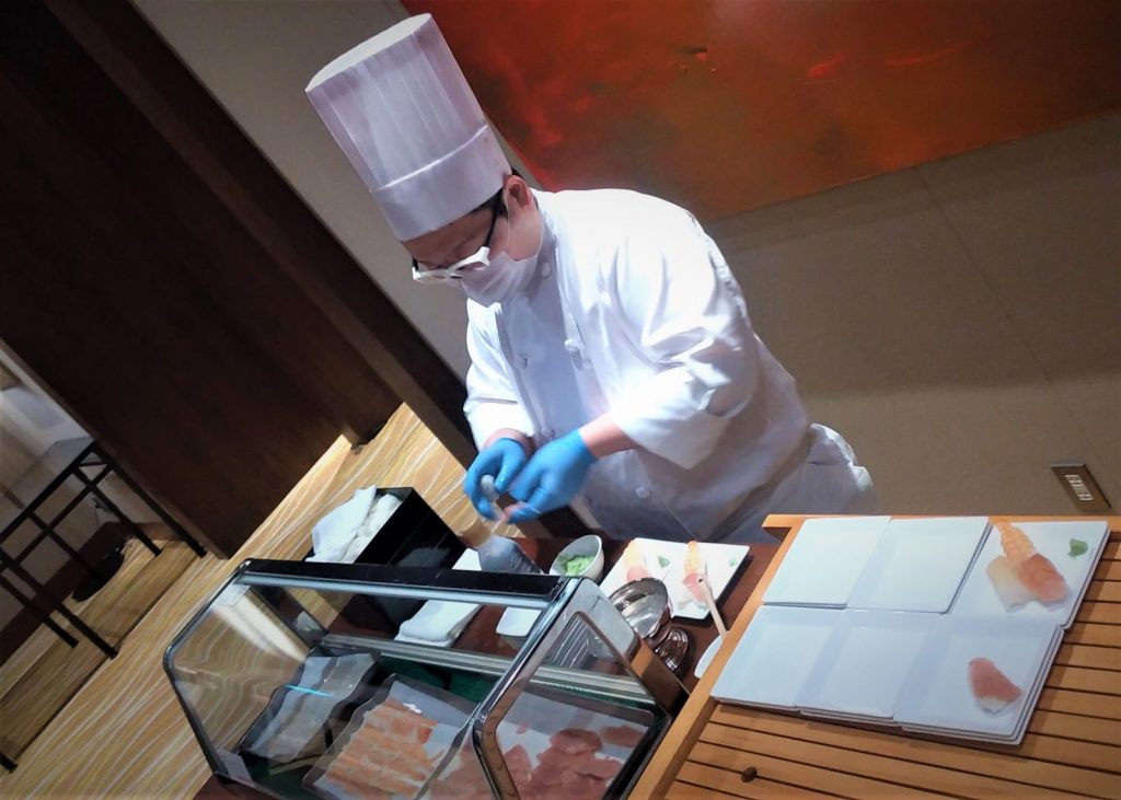 お寿司も注文ごとに握りたてを提供。 ネタはびんちょう鮪・蒸し海老・ヤリイカの3種