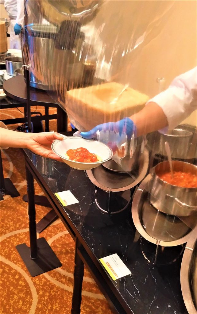 共有トングを使用する大皿での料理提供はせず、すべて小皿に取り分け。それぞれの料理前とライブキッチン前には透明なビニールシートで隔たりを設けています。