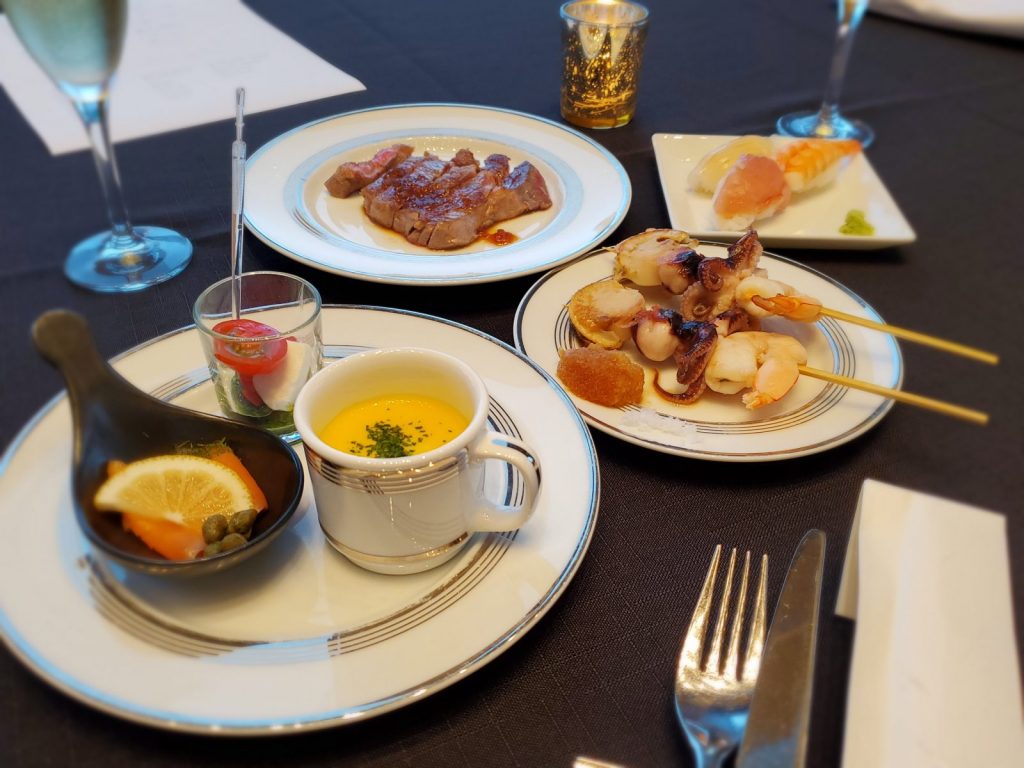 (手前から)かぼちゃの冷製スープ、スモークサーモンディルマリネ、夏野菜のピクルス、魚介の串焼き、牛ロース肉の鉄板焼き、握り寿司