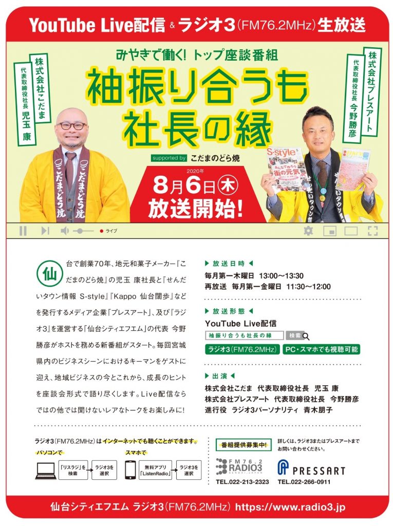 仙台で創業70年、地元和菓子メーカー「こだまのどら焼き」の児玉 康社長と「せんだいタウン情報 S-style」「Kappo 仙台闊歩」などを発行するメディア企業「プレスアート」、及び「ラジオ3」を運営する「仙台シティエフエム」の代表 今野勝彦がホストを務める新番組がスタートします!