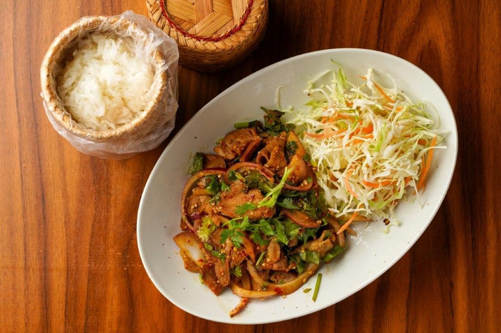 レモンの酸味がアクセントの「ナントモー(豚肉スパイシーサラダ)」(1,000円)は「もち米」(320円)と合わせてどうぞ