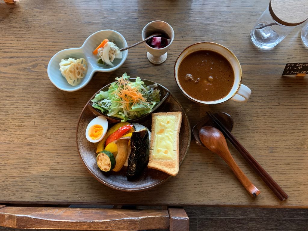 こちらはランチで人気のスープカレー!専用のお皿(中央)に、サラダと野菜、パンがしっくり収まっています
