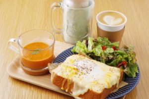 たっぷりのチーズと半熟タマゴがとろけるクロックマダムと濃厚なエビのトマトクリームスープがセットのランチプレート。