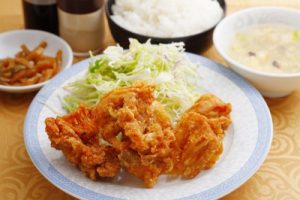 鶏もも肉に塩コショウ、そしてほんの少しの豆板醤で下味をつけ、パリッと揚げた唐揚げ定食が登場。