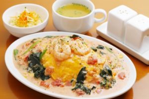 生クリームとミルクを合わせた自家製トマトソースに、エビやホウレン草、ベーコンの旨みを加えたオリジナルオムライス。