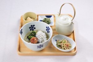 「釜揚げしらすと南高梅のだし茶漬け」は、ふっくらとしたしらすと大玉の梅に、野沢菜をあしらったひと品