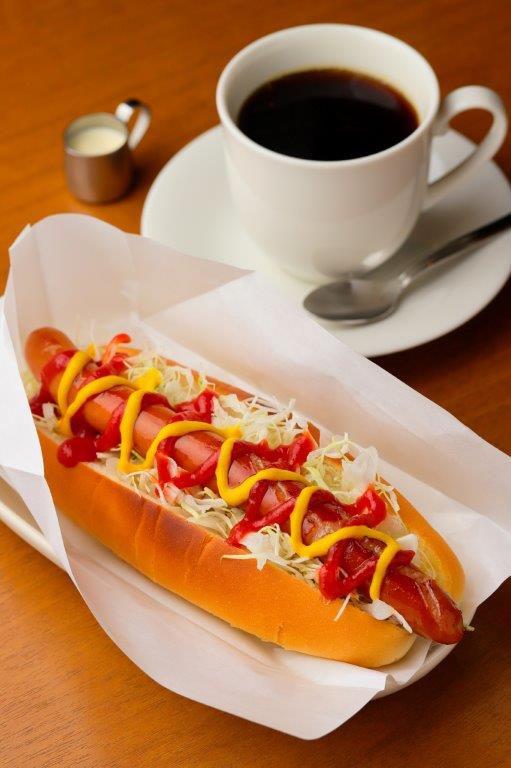 軽く焼いたパンに、オリーブオイルで焼いたウインナーとたっぷりキャベツを挟んだ「ホットドッグSet」は、コーヒー付きで500円