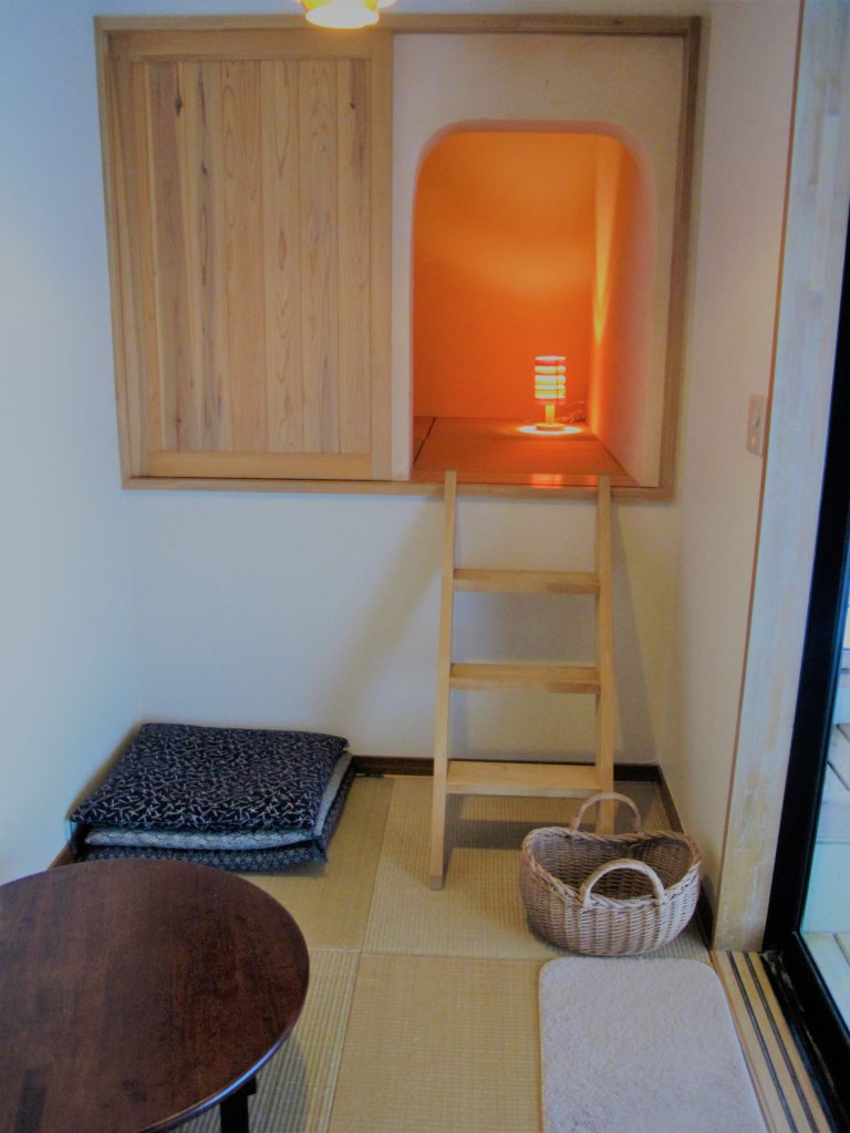 私が「ここはぜひとも泊まりたい!」と魅了されたのは、隠れ小部屋のようなスペースのある客室。1室しかない特別な部屋だそうで、オレンジ色の光に包まれた不思議な空間では読書をしたり、瞑想したりと思い思いの時間を過ごせそう。