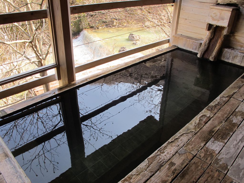 大きな浴槽になみなみと注がれる源泉。目の前にはごうごうと音を立てて流れる濁川と切り立った岩がドドンと広がっています。開放感あふれる魅力的な貸切露天です。また、峩々温泉では温泉のお湯をお腹にかける「かけ湯」という入浴方法もおすすめしています。便秘解消や胃腸に良い効果をもたらしくれるのだとか!