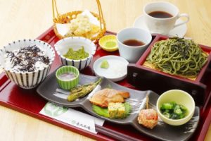 京都宇治抹茶を練り込んだ茶そばは香り高く、秘伝のつゆが引き立てる。茶葉入りの衣をまとった天ぷら、変わりご飯も美味。