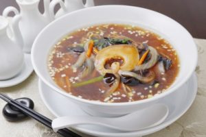 鶏ガラベースのコクのあるしょうゆスープに野菜のあんかけをオン。さらに気仙沼産のフカヒレをのせた見た目にも贅沢な一杯。
