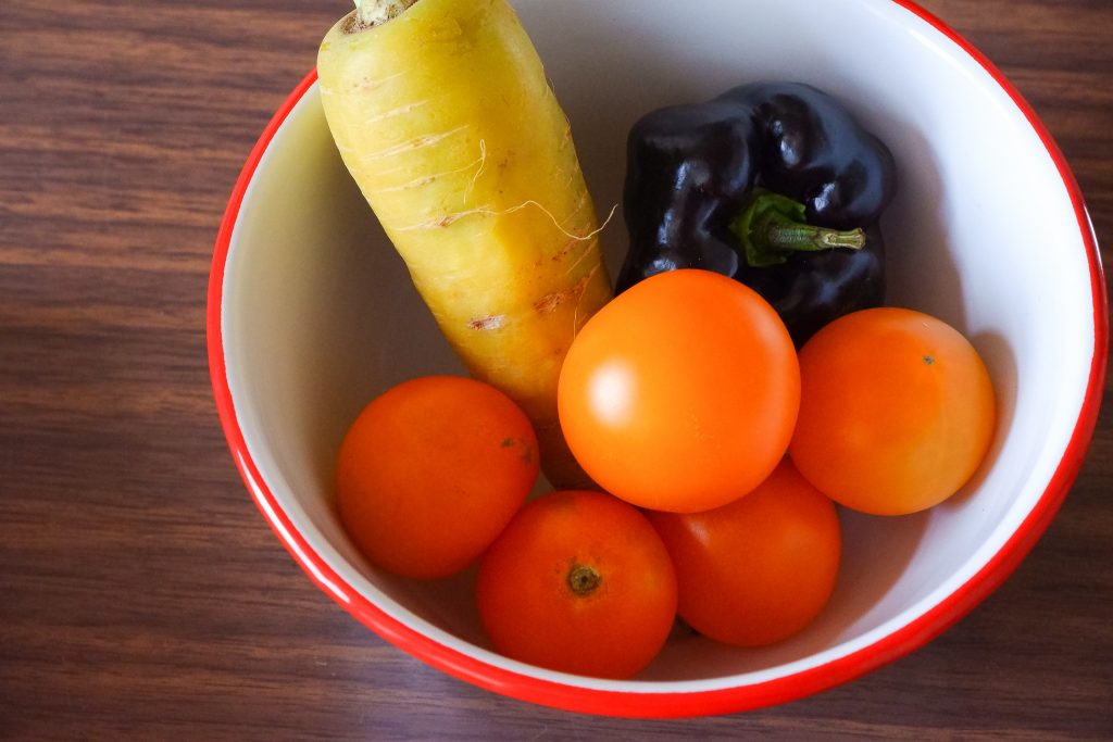 オレンジ色のトマトは、色麻町「ともちゃんの野菜畑」の「シンディオレンジ」。黒ピーマンと黄人参とあわせて、カラーリングが珍しくて可愛い!