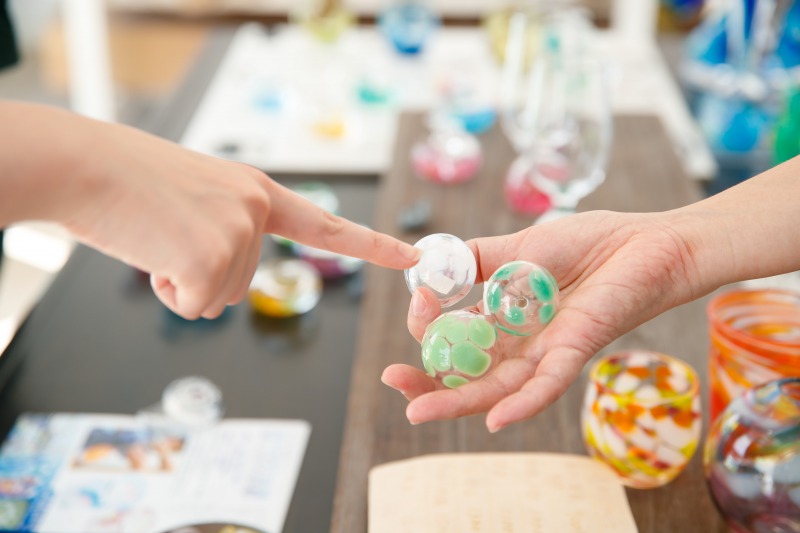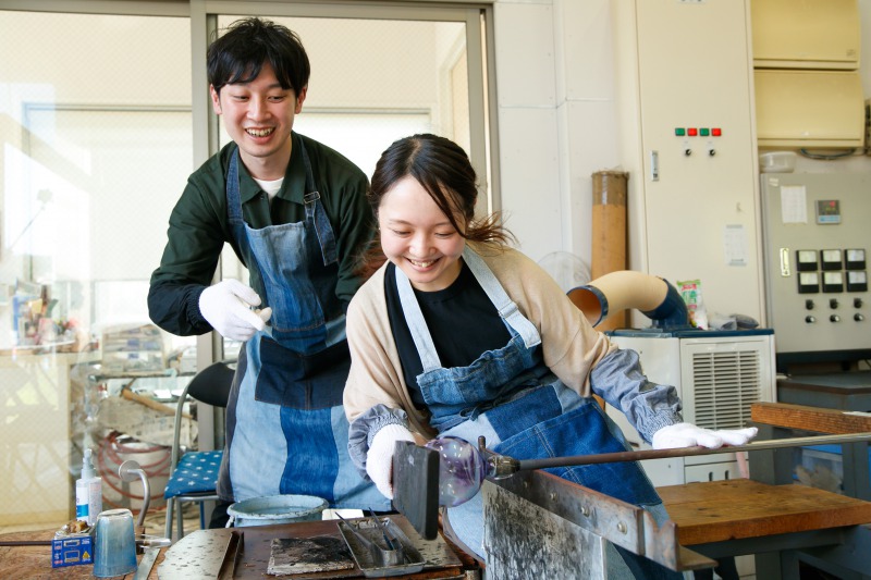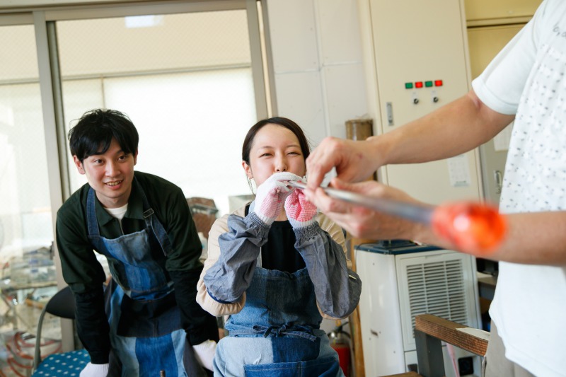 世界にたった一つのオリジナルグラスが作れるコース。高温の炉で水あめのように溶けたガラスを吹き棒で膨らませたり、鉄の道具で成形したり。温度と時間との勝負でもあり、ドキドキの連続ながら、吹きガラス作家として活躍するオーナーがマンツーマンで指導してくれるから安心。「ここぞ!」という場面ではちょっとしたお手伝いがあるので、初心者でも挑戦できる。コップ、小鉢、一輪挿し、風鈴の多彩なデザインからセレクトできて、カラーも20色から好きなだけ組み合わせられるのがポイント。炉の熱気に満ちた工房で、職人気分を体験しよう!