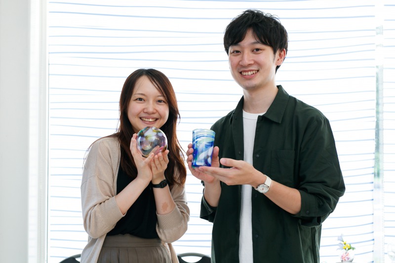 秋色のシックなグラスと一輪挿しの出来上がり!この中に自分の息が吹き込まれていると思うと感動。ぽってりと手に馴染む形も愛おしい。完成品の受け渡しは翌日10時以降で、郵送にも対応。