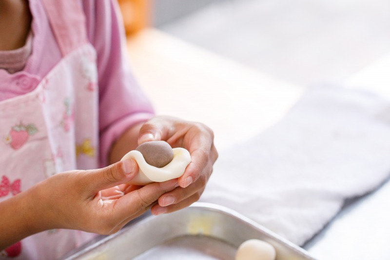 「あん切り」したあん玉を他の色のあんで包み、多色の層状にしていく。人差し指と親指でくるっと回転させながら包むのがポイント!