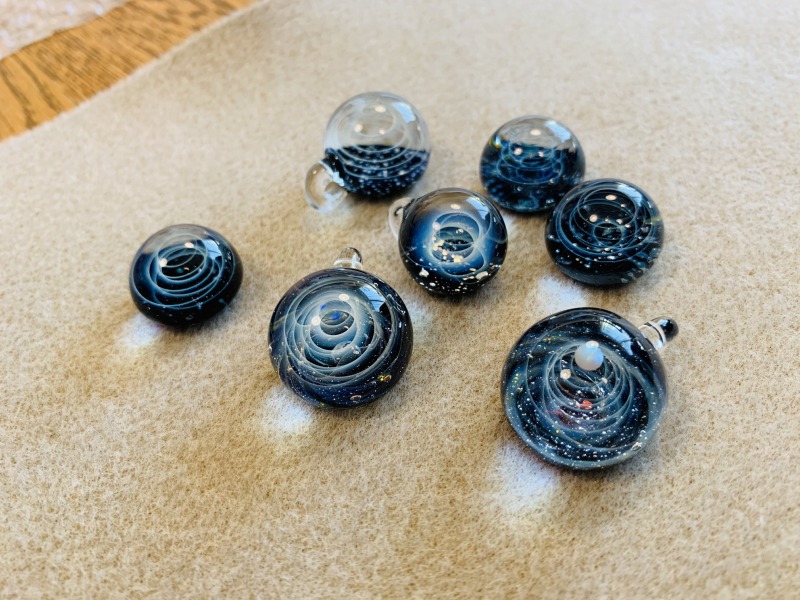 小さなガラスの中に渦巻く宇宙、不思議にきらめく人工オパールの星。耐熱ガラスを高温の酸素バーナーで溶かし作成します。講師が丁寧に指導するので、初めての方でも安心です。完成した作品は、ご希望によりネックレスに加工し当日持ち帰ることができる。