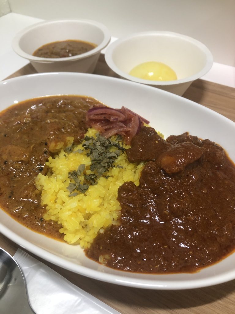 編集部はぜいたくに「スパイシーチキン(中辛)」と「ポークビンタルー(中辛)」の2種盛り(900円)をいただきました!