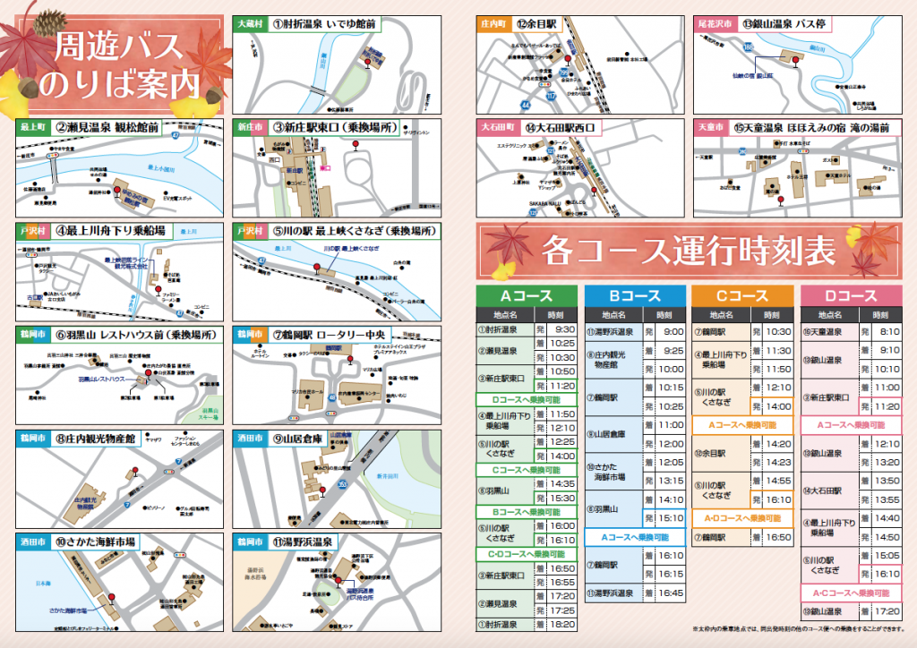 期間限定で、最上エリアと庄内エリアを結ぶ観光周遊バスを運行します。観光スポットや温泉地を巡るバスのコースは全部で4本!ご自身の旅行プランに合わせて、自由自在に乗り換えも可能です。紅葉の時期に合わせて運行する期間限定の周遊バスとなりますので、この機会に庄内・最上周遊を楽しもう!