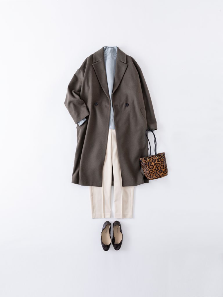 「ドロップチェスターコート」(49,500円)、「ウール100%タートネックニット」(17,600円)、「テーパードパンツ」(19,800円)、「レオパードミニバッグ BAGSINPROGRESS」(69,500円)、「バレーシューズ E. PORSELLI」(31,900円)