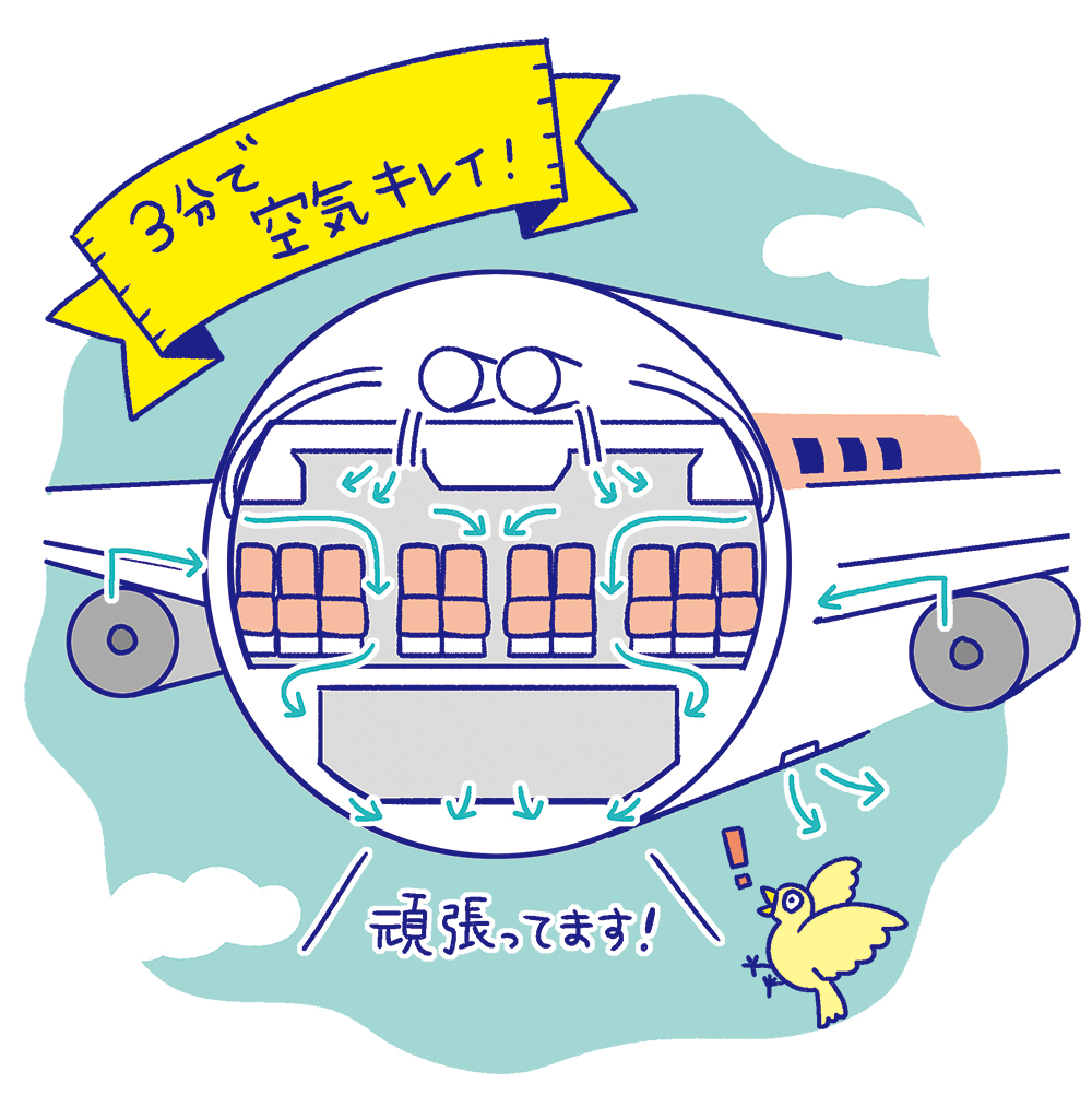 機内の空気は機外からの新しい空気を取り入れており、常に循環しています。すべて入れ替わるまでは、なんとたったの3分ほど! 機内に取り込む空気は病院の手術室にも使用されている高性能なフィルターでろ過されているので、清潔に保たれています。