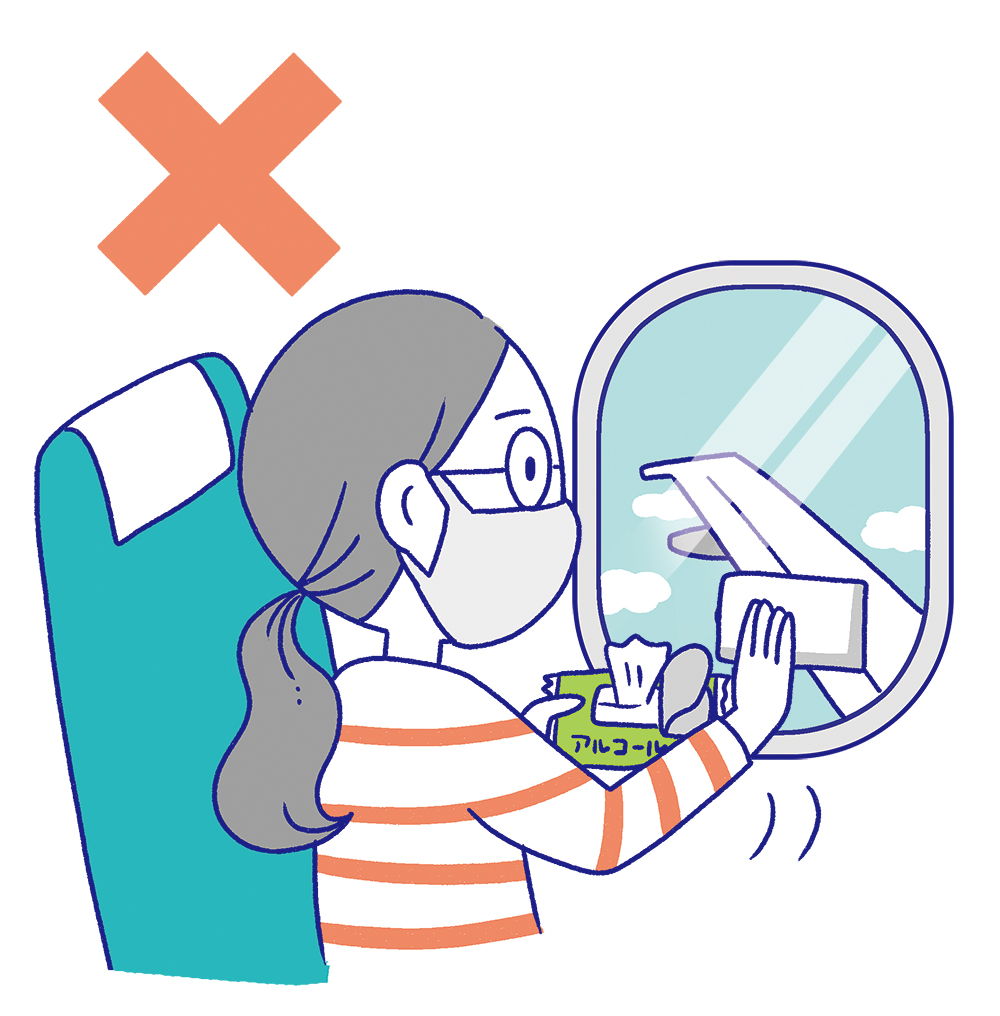 機内の窓はアクリル樹脂でできているので、アルコールを含んだ除菌シートなどで窓を拭くと白く曇ったり、ひび割れする可能性があるので注意しましょう。