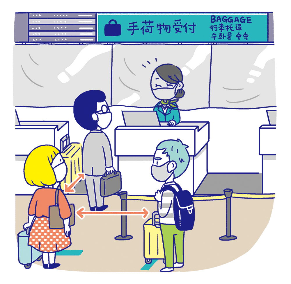 手荷物カウンター前の列での密を避けるため、一定の距離を保って並べるよう待機位置を示した目印が貼ってあります。また、マスクを着用したスタッフと利用者の間にはカウンターにはビニールカーテンが導入されており、飛沫感染防止対策を行っています。