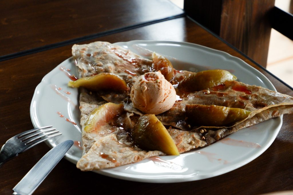 丸い生地を折りたたんだ三角形のガレットに、自家製ジェラードとイチジクがのっています
