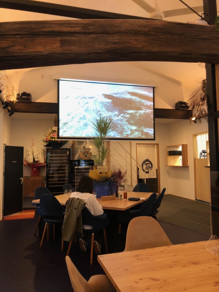店内奥側のテーブル席。2名毎にアクリル板も設置されており、コロナ対策もバッチリです。そして大きなスクリーンも!