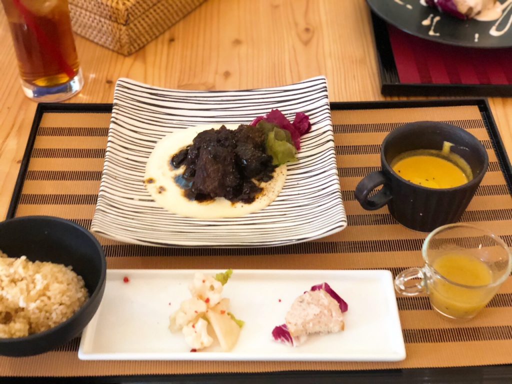 こちらはお肉ラヴァーのマタギが選んだ「黒毛和牛の黒胡椒赤ワイン煮込み」。”ホロッホロです先輩…!”とのことで、大層感動した様子でした。