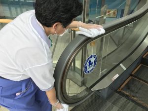 エスカレーターや保安検査場のトレーなどの共有部分の定期消毒、館内の共有スペースでのソーシャルディスタンス確保の呼びかけなどを行い、感染予防に配慮しています。サーモグラフでは体温を確認することで、体調チェックに役立てることができます。