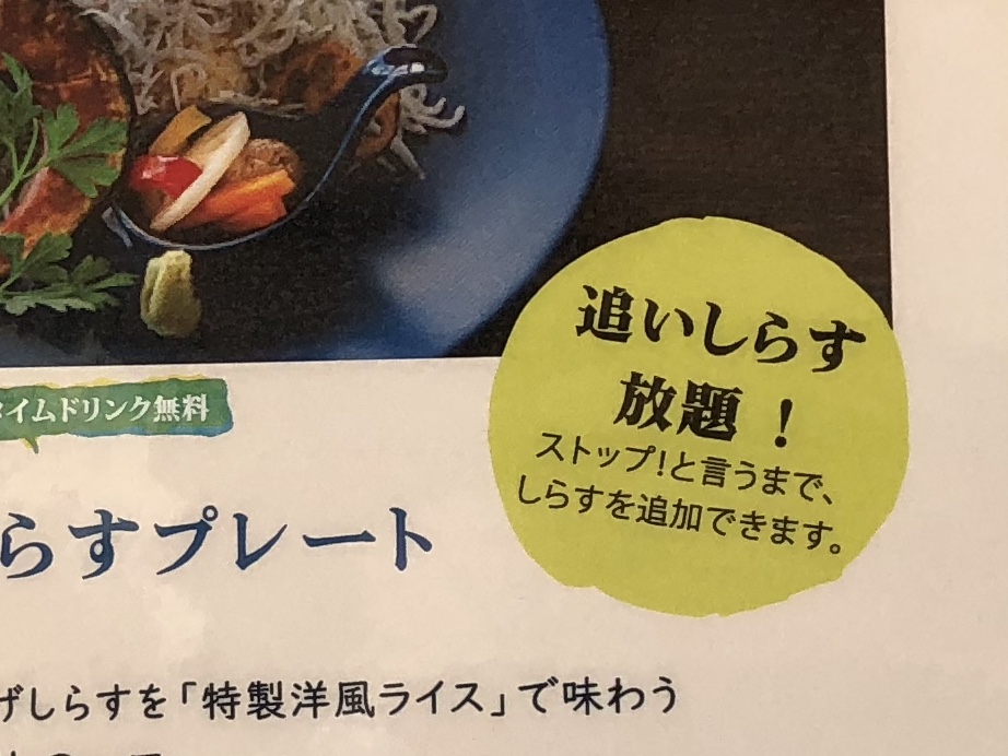こちらが問題の「釜揚げしらすプレート」。ふむふむ、普通においしそうなプレートです。シラスもこんもりとONザRICEしてますね。