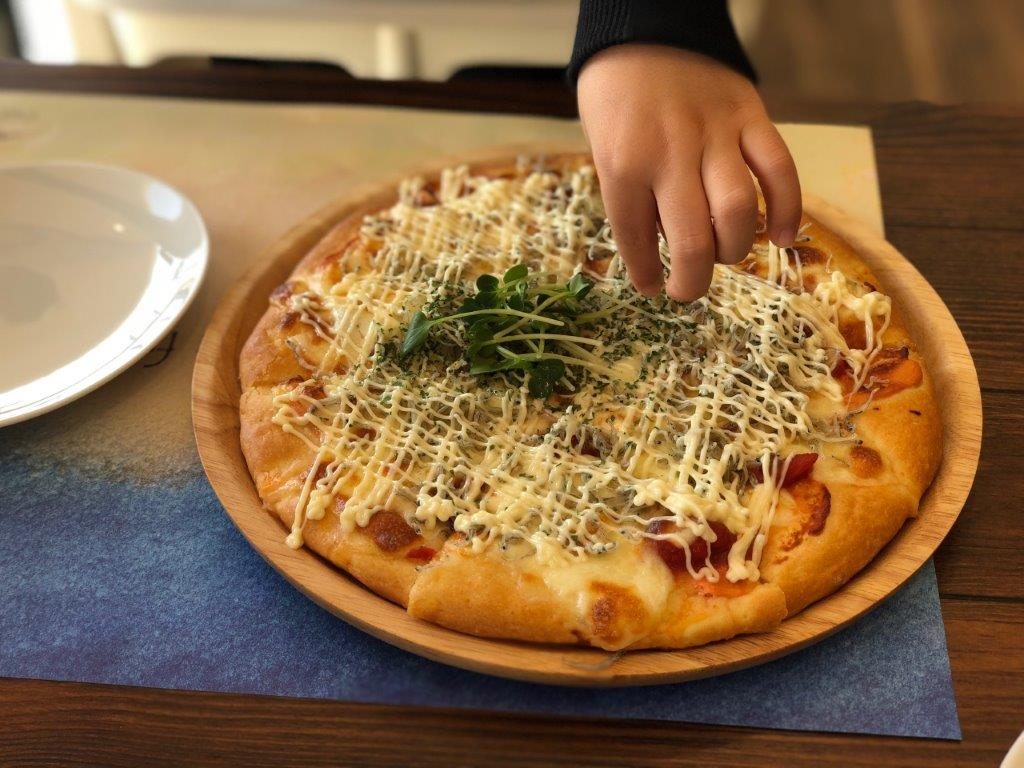 「しらす明太マヨピザ」。余った分は持ち帰りもOKでした。ありがたい限り!