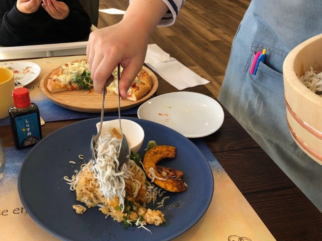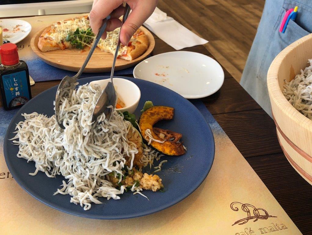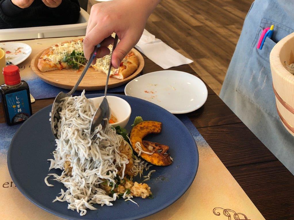 ちなみにメニューはこんな感じ。私は「釜揚げしらすプレート」、息子は「しらす明太マヨピザ」を頼みました!