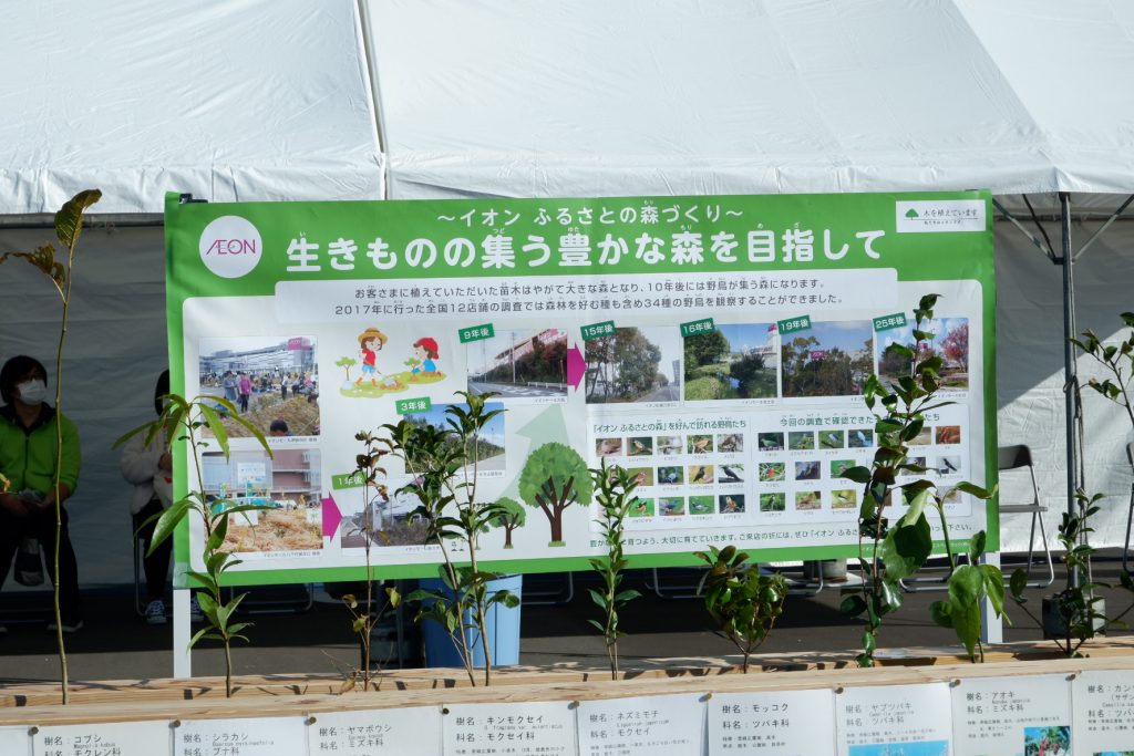 イオンが目指すのは「生きものの集う豊かな森」。大きく育った木々の豊かな緑では、野鳥が観察されることもあるみたいですよ!10年後が楽しみですね!