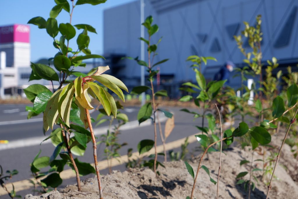 『イオンモール新利府 南館』は、2021年春にグランドオープン予定。今日は「イオン ふるさとの森づくり」植樹祭と題し、利府町長・熊谷 大(ゆたか)さんや地域住民およそ200名が参加し、68種約24,000本が植樹されました。