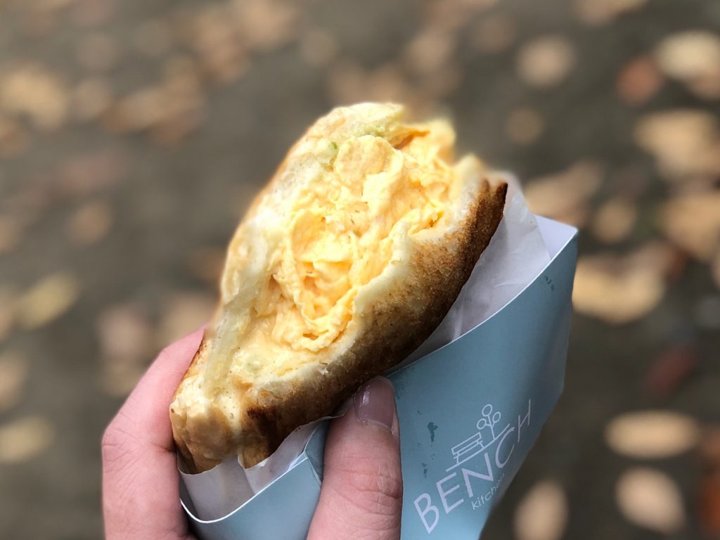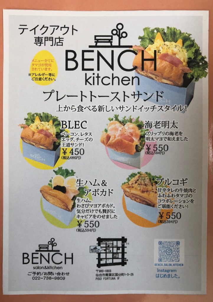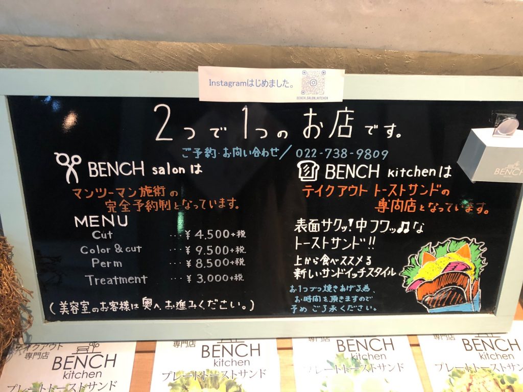 「2つで1つのお店です」。ということで、店の手前側がテイクアウト専門でトーストサンドを提供する「BENCH kitchen」、奥はマンツーマン施術の完全予約制サロン「BENCH salon」となっています。面白い形態のお店ですね!