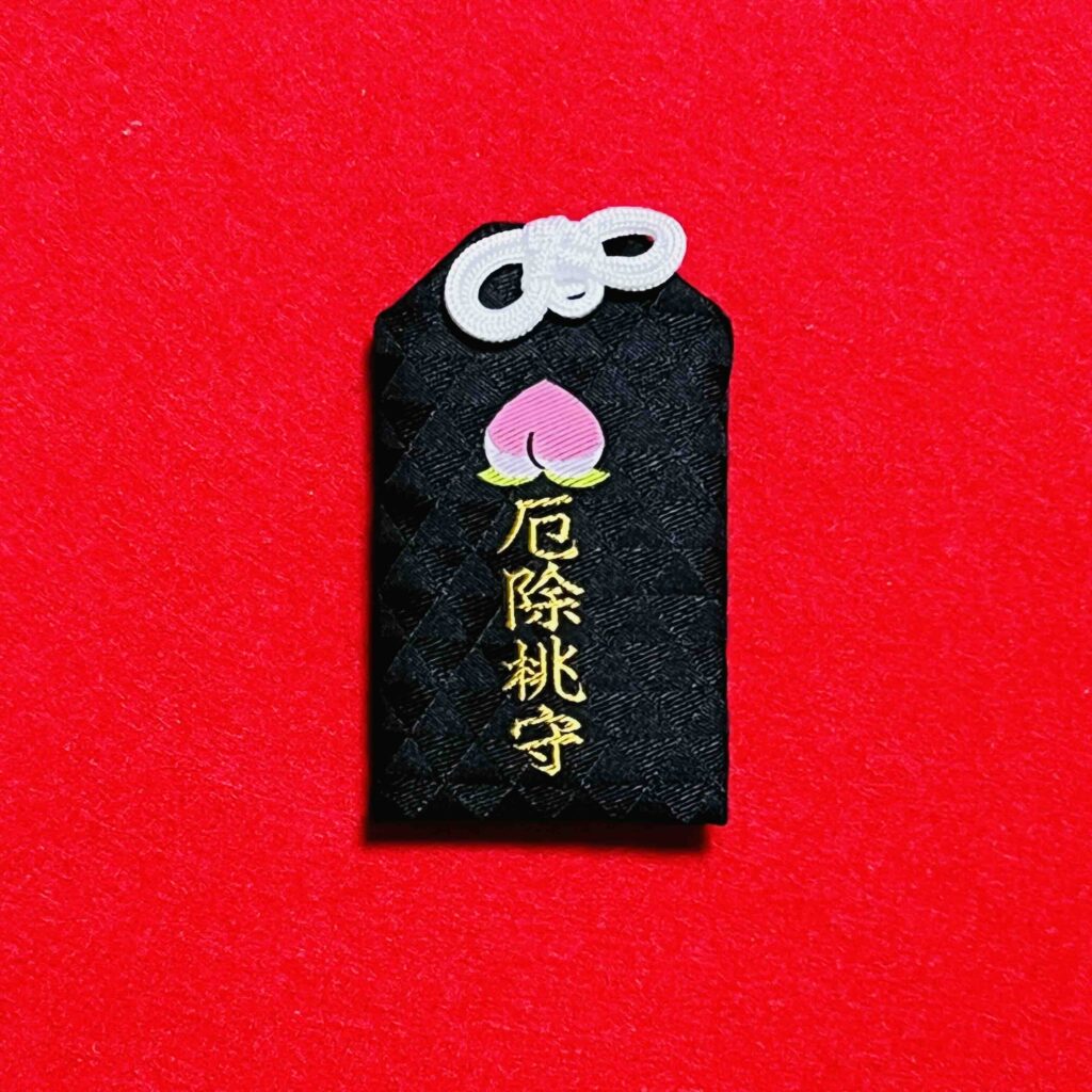 古事記の桃の故実にちなんだ厄除桃守。細糸織りで肌触りも良く繊細で美しい授与品