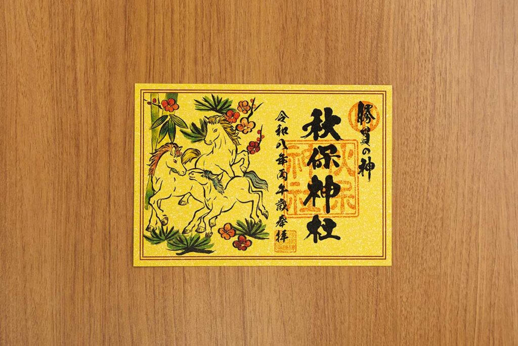可愛らしい3頭の馬が描かれた新春限定の御朱印。おめでたい金色が印象的