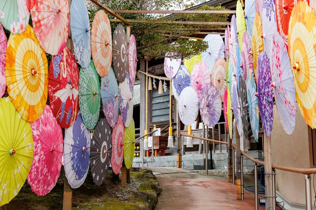 6.彩り豊かな和傘がお出迎え 縁結びの神が見守る和やかな神社『八坂神社』