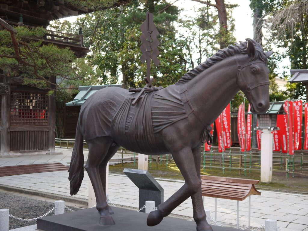 境内には神馬像の「撫で馬」があり、頭や胴をやさしく撫で、すべてがうまくいくことを願う参拝者が絶えません。