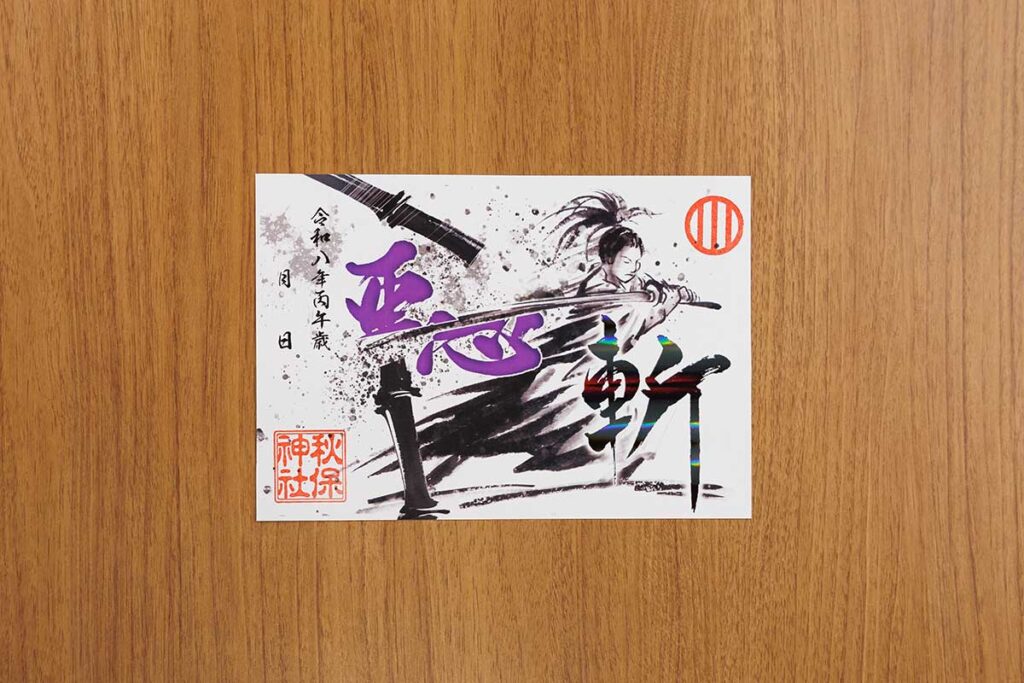 悪運を断ち斬る刀がモチーフの令和8年度限定の御朱印。「斬」の文字にはホログラムの箔押し加工が※数量限定