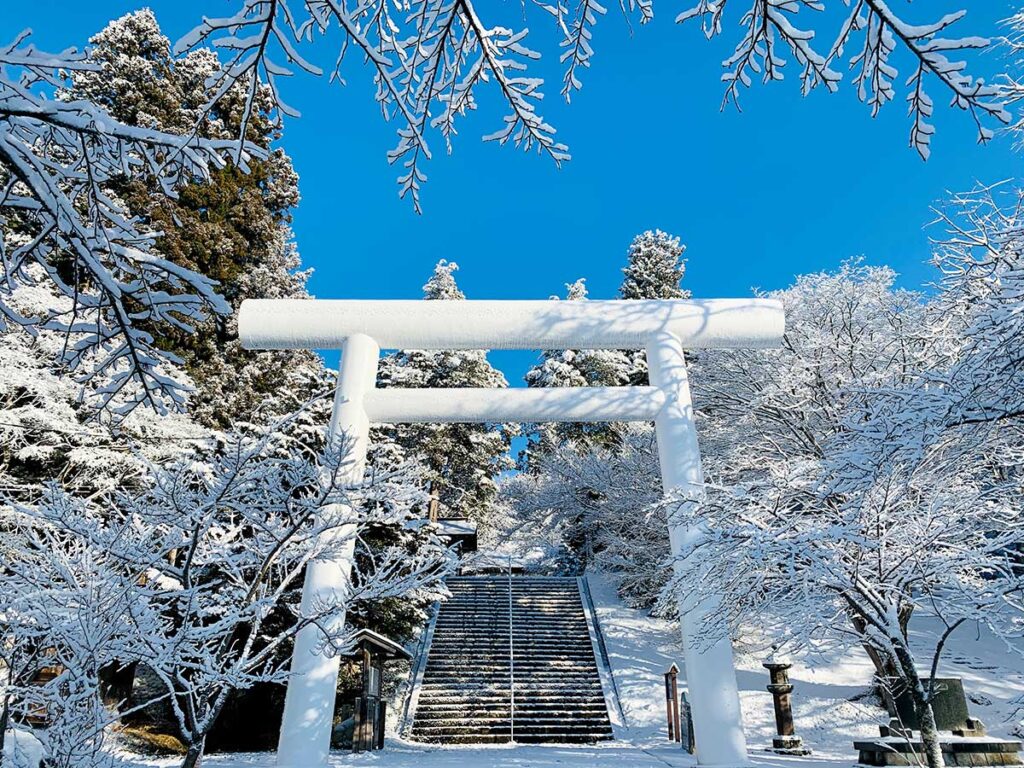 新雪をまとい凛と佇む白大鳥居。静けさの中で心を整えてくれる冬の情景