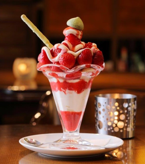 『ラ・クロンヌ・ドル』の期間限定イチゴパフェ(1,400円)は爽やかなパンナコッタをベースに、濃厚なストロベリーソースで合えイチゴを贅沢にトッピング