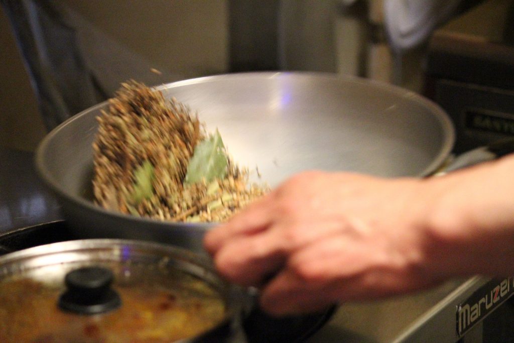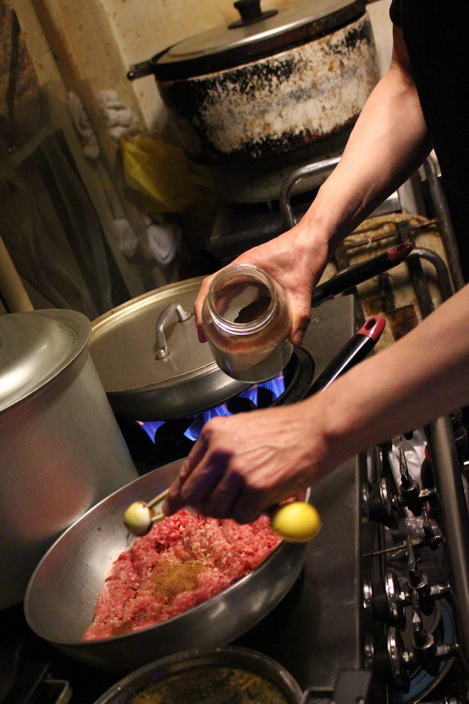 『yaman』の朝は仕込みから始まる。日によって変わるが、一日で使うご飯の量はおよそ2升。宮城県産「ひとめぼれ」を手際よく研ぎ、キーマカレー用の挽き肉、店の人気メニュー「yamanカレー」で使う鶏肉、すべてのカレーのベースとなるルウ、オリジナルブレンドのガラムマサラ、と手際よく淡々と調理を進めていく。流れるような作業にじっと見入ってしまうほどだ。聞けばこの仕込み、ご飯とスパイス以外はすべて翌日以降に出すカレーの準備だそう。山下さんのこだわりでルウや挽肉は最低でも1日冷蔵庫で寝かせる。スパイスは作りたてが一番香りがよいとされるが、ルウに至っては寝かせることで味を落ち着かせ、旨みを引き出す。この手間こそがおいしさの秘訣。そして、寸胴の内側に年輪のように刻み込まれた軌跡が物語るようにルウは継ぎ足し。足りなくなったら都度新しいルウを入れていく。創業当時からのルウは震災時に途絶えてしまったが、震災後から7年間、鍋の底を見ていないそうだ。