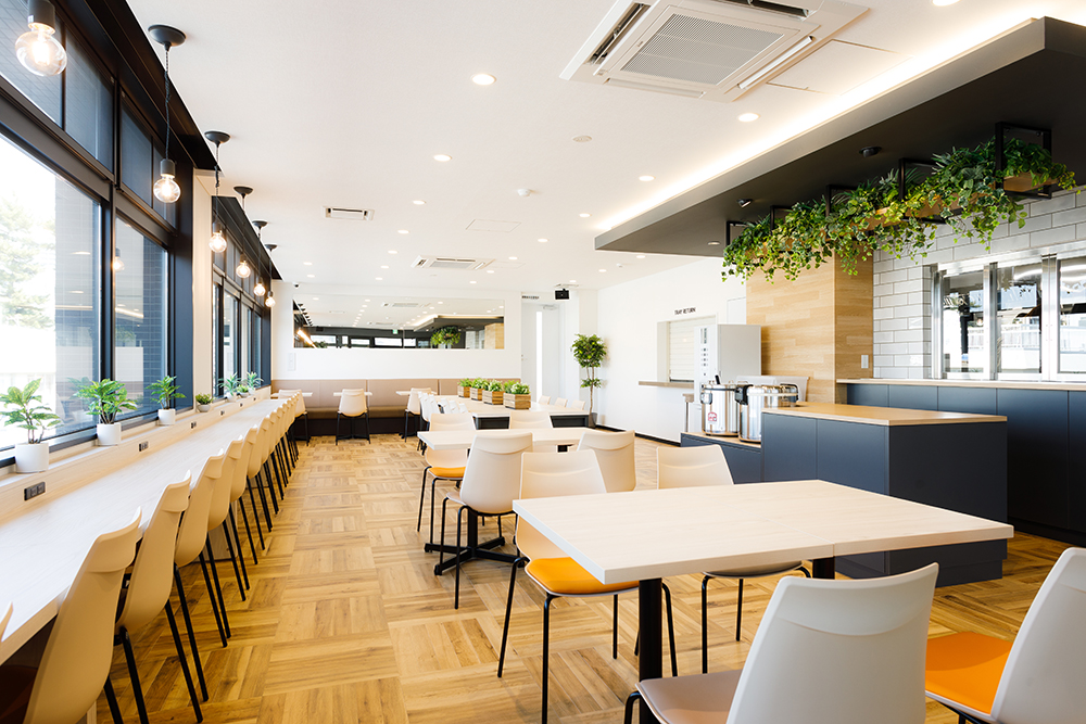 学生マンションの最上階にはカフェテリアが。その他、勉強や談話に最適なラウン ジや、運動やイベントに利用できるアクティビティスタジオなどもある。空間にこだ わりを持つマルタマならではの触れ合いながら学びあえる物件だ