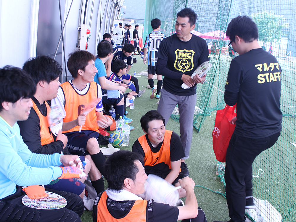 「フットサル大会マルタマカップ」 に参加してくれたチームと交流を図る 社員。地域に根を張った活動で社会 貢献を続けている